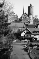 Die Hinterburg nimmt die südliche Ecke des Stadtbergplateaus ein und ist insbesondere mit ihrem aufragenden Turm wirkungsvoll im Stadtbild von Schlitz. Die Entstehungszeit der Burg ist unbekannt. 1439 werden zuerst "die beyde Burge" genannt; um diese Zeit dürfte die Hinterburg in ihren Grundzügen durch einen Zweig der Familie der Herren von Schlitz als eigener Sitz, unabhängig von der älteren Vorderburg, fertiggestellt worden sein. Die Hinterburg besteht aus dem charakteristischen runden Turm und zwei sich stark versetzt gegenüberstehenden Wohnbauten. Der Turm ist etwa 36 m hoch und aus Sandstein errichtet. Er besaß im unteren Teil bis zum Einbau eines Fahrstuhls zwei übereinanderliegende Räume, die als Verliese gedient hatten. Noch aus dem 18. Jahrhundert blieben am Putz der Innenwand Inschriften der Insassen erhalten. Der Turm schließt mit einem Zinnenkranz und einem gemauerten Kegel ab, der 1907 nach der ersten Abbildung der Stadt aus 1624 rekonstruiert wurde (vorher hatte dort eine Wachstube von 1731 eine runde, schiefergedeckte Haube). Bemerkenswert sind unterhalb der Zinnen vier auskragende Steinplatten mit je zwei runden Öffnungen. Ihre Funktion ist unklar, vielleicht besteht ein Zusammenhang mit ursprünglich vorgesehenen Wichhäusern, vgl. Friedberg, Adolfsturm. Schriftliche Quellen, den Bau des Turms betreffend, fehlen. Ein Mauerstein außen zeigt die eingekratzte Jahreszahl 1572; damit wäre, nach der neuesten Literatur (Dehio 2008), die Entstehung festgelegt, während frühere Beschreibungen die Bauzeit unterschiedlich zwischen dem frühen 13. und dem 15. Jahrhundert einordnen. Der neben dem Turm stehende ältere der beiden Wohnbauten der Hinterburg ist in seinen zwei unteren Geschossen, verändert um die Mitte des 16. Jahrhunderts, massiv und hat zwei spitzbogige Portale; das zum Hof (vielleicht hierher transloziert) zeigt die Wappen Schlitz und Klüppel von Elkerhausen sowie, untergeordnet, Boyneburg, ein seitliches mit aufwendigerer Profilierung und gedrücktem Spitzbogen erinnert an die inneren Türgewände im Turm der Vorderburg von 1565. Das obere Geschoss ist als einfache Fachwerkkonstruktion mit ausgearbeitetem Schwellen- beziehungsweise Rähmkranz 1653 errichtet worden. Darauf weist eine neben dem Schlitzer Wappen und Initialen wohl der Zimmerleute gestalterisch anspruchslos in einen Eckständer eingeschnittene Datierung hin. Vom Fachwerkgeschoss aus führt eine gedeckte Holzbrücke in den Turm, sie war bis zum Einbau des Fahrstuhls um 1960 der einzige Zugang dorthin. An der dem Hof abgewandten Traufseite erhebt sich ein schlanker, über die Traufe hinausragender Treppenturm, innen datiert 1553. Im Westen steht über der Hangkante zum Sengelbach ein dreigeschossiger verputzter Massivbau mit sichtbarer Eckquaderung. Seine schönen geschweiften Renaissancegiebel sind mit Kugeln und Wetterfahnen besetzt. Die teilweise gekuppelten Rechteckfenster haben fein profilierte Gewände. Zum Hof ist vor der Fassade ein runder Treppenturm mit Fachwerkobergeschoss und geschweifter Haube errichtet. Entstanden ist der Bau 1561 bis 1565, verändert wurde er 1647; damals wohl ist rückwärts ein schmaler erkerartiger Vorbau angefügt worden, der in allen drei Geschossen durch Fensterbänder geöffnet ist. Die Gebäudegruppe der Hinterburg, heute genutzt durch das Seniorenstift Burg Schlitz (hervorgegangen aus dem 1950 hier eingerichteten Graf Görtzischen Altersheim) hat wesentlichen Anteil an der Ausbildung der Schlitzer Stadtkrone, ist ein bedeutendes Dokument der Geschichte der Stadt und des Landes und vermittelt Formen herrschaftlichen Wohnens der Spätgotik und der Renaissance.