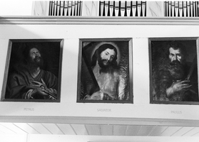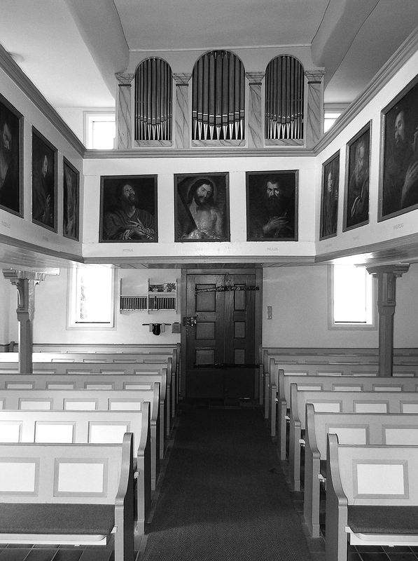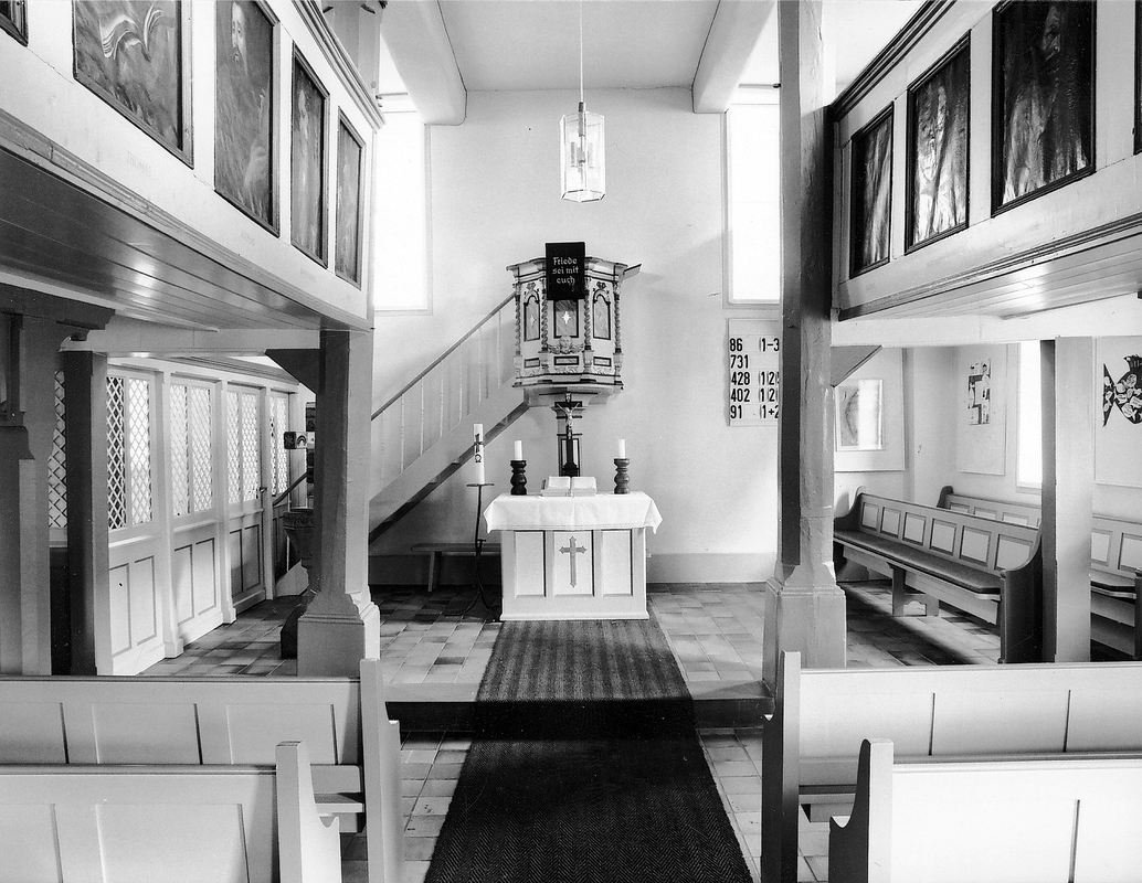 Das Innere hat eine Flachdecke, deren zwei Längsunterzüge auf kräftigen, zum Altar hin gerückten Holzstützen ruhen. Die dreiseitige Empore ist auf die an der südöstlichen Schmalseite angebrachte, reich gestaltete Kanzel aus der Zeit um 1733 (Dehio) ausgerichtet. Die Längsseiten der Empore sind 1867/68 vergrößert worden, aus dieser Zeit stammen die schlanken Holzstützen mit ihren Sattelhölzern. Bemerkenswert ist die Ausstattung der Brüstungen mit Porträts aus Altem und Neuem Testament sowie Luthers und Melanchthons. Die Bilder wurden angeblich 1749 "angeschafft", sie stammen offensichtlich aus verschiedenen Händen. Insbesondere die großen Brustbilder sind von "überraschend guter Qualität" (Dehio); die Reformatorendarstellungen zeigen eine enge Verwandtschaft mit den Bildern in der Kirche von Groß-Eichen. Die Orgel auf der Empore über dem Haupteingang wurde 1839 wohl von Johann Hartmann Bernhard aus Romrod hergestellt; ihr schlichter Prospekt wird durch glatte Pilaster gegliedert. Teil der ursprünglichen Ausstattung ist der Taufstein von 1637 in eckiger Kelchform mit Umschrift: ANNO MDCXXXVII HOC BAPTISTERIUM GIDIVS CRAMER PASTORFF.