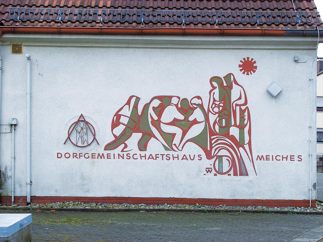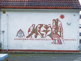 Das Meicheser Dorfgemeinschaftshaus entstand 1952 im Zentrum des Dorfs und war das erste im Kreis Lauterbach und das sechste in Hessen. Es wurde 1969 verändert und 1983 deutlich nach Südwesten erweitert, wobei auf eine Fachwerkarchitektur zurückgegriffen wurde. Der Ursprungsbau, eingeschossig, verputzt und mit steilem Satteldach abschließend, erinnerte an gleichzeitige ländliche Schul-, aber auch an zeittypische städtische Wohnbauten. Deutlich blieb dies am Nordgiebel. Erhalten ist das in den Putz der Nordmauer des kleinen Seitenflügels gearbeitete Außenwandbild aus der Entstehungszeit. Es zeigt – stark stilisiert – Menschen, die zusammensitzen, und eine ihnen zugewandte junge Familie. Attribute wie ein Akkordeon, eine Garbe, ein Krug und die tiefstehende Sonne im Hintergrund lassen Feierabendstimmung assoziieren. Das Bild mit der Unterschrift DORFGEMEINSCHAFTSHAUS MEICHES und einer Signatur "W" ist als Sachteil aus geschichtlichen Gründen zu erhalten.