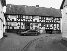 Großer, hinter der Kirche situierter und den Straßenraum abschließender Einhof, nach der etwas verschliffenen Bauinschrift durch den Zimmermeister Johannes Rasch (Rausch) aus Allmenrod 1792 fünf Zonen breit konstruiert und im 19. und 20. Jahrhundert teilweise erneuert, wobei der Einbau breiter Fenster und die Veränderung der Eingangssituation Störungen bedeuten. Vom Ursprungsbau ist der durch klassische Mann-Figuren bestimmte Fassadenaufriss, die ausführliche Inschrift an der Stockschwelle und die Schnitzerei an einem Eckständer erhalten, die jüngeren Erneuerungen (Ersatz von Stall und Tenne) erfolgten teilweise in Anlehnung an das ursprüngliche Konzept.