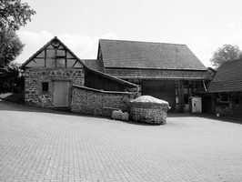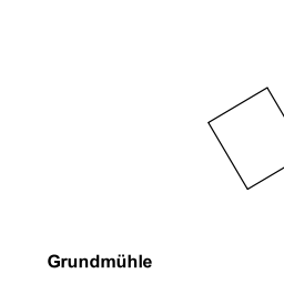 Einen halben Kilometer westlich des Dorfs steht am Eichelbach die Grundmühle. Ihre Hofreite wird im Westen durch den breit gelagerten Fachwerktrakt begrenzt, der als Wohnhaus dient und in dem früher auch der Mühlenbetrieb untergebracht war. Das Gefüge ist einfach verriegelt und mit - an den Schmalseiten symmetrisch eingesetzten - Geschossstreben ausgesteift; es besteht noch ein leichter Geschossvorsprung. Zwei nachklassizistische zweiflügelige Haustüren sind erhalten. Die Entstehungszeit ist um 1800 anzusetzen. Wenig jünger ist der gegenüber aufgebaute Wirtschaftstrakt. Er besteht aus einer großen dreizonigen aus konstruktivem Balkenwerk gefügten Scheune, die transloziert sein soll und im Giebel die Jahreszahl 1899 erkennen lässt. Sie wird flankiert von einem niedrigeren Stallgebäude und einem Backhaus, beide wesentlich aus Basalt gemauert. Die so recht vollständig erhaltene Hofanlage ist aus geschichtlichen Gründen Kulturdenkmal.