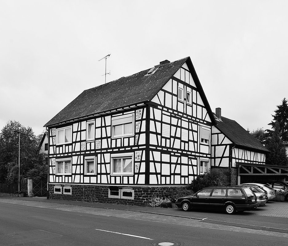 Das repräsentative Wohnhaus einer großen Hofanlage des mittleren bis späten 19. Jahrhunderts ist als zweigeschossiger Fachwerkbau traufständig zur Straße errichtet. Der Sockel ist aus Basaltquadern gemauert, das Fassadenbild, nach klassizistischer Manier symmetrisch ausgebildet, leidet unter der Vergrößerung der Fenster und dem Verlust des die mittlere der fünf Achsen ursprünglich bestimmenden Eingangs, jedoch bleibt die städtebauliche Bedeutung des Hauses davon unberührt. Die seitliche Hofeinfahrt wird von sandsteinernen Torpfosten aus der Bauzeit des Hauses flankiert, rückwärts ist ein Wirtschaftsgebäude aus Fachwerk erhalten.