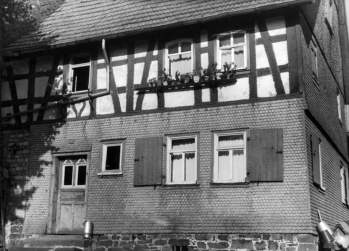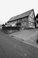 Großer Fachwerk-Einhof des frühen bis mittleren 19. Jahrhunderts. Er wurde in einem konstruktiven Gefüge mit doppelter Verriegelung und dichter Reihung geschosshoher Streben errichtet, die an der freien Giebelseite teils durch kurze, schräg eingesetzte Stile oberhalb der Halsriegel ergänzt werden. Der ehemalige Stallbereich ist massiv ersetzt und die Front des Wohnteils leider mit Brettern verkleidet - oberhalb der Haustür erschien als einziges Schmuckmotiv ein Herz. Trotzdem ist das Bild eines großen, repräsentabel auftretenden Einhofs nachzuvollziehen, dem im Umfeld der Kirche auch eine wesentliche städtebauliche Bedeutung zukommt.