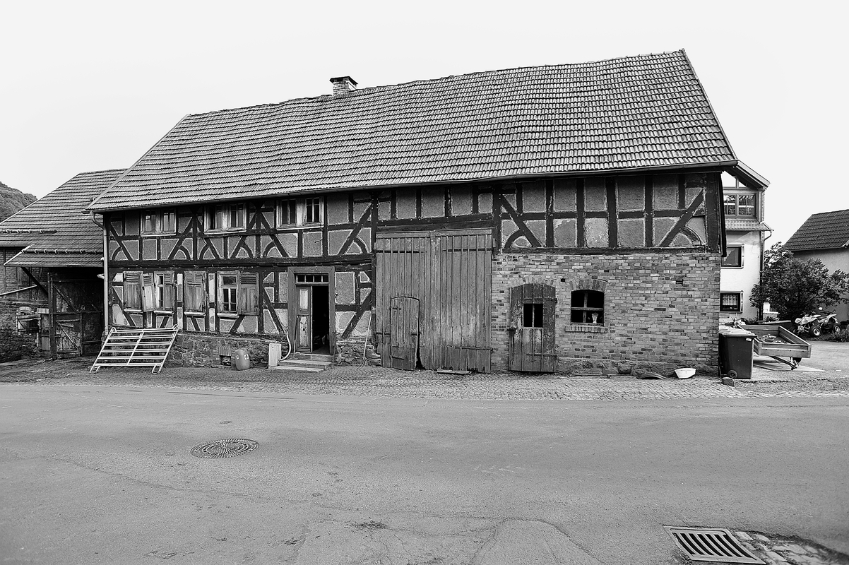 Der fünfzonige Streckhof zeigt ein ansprechendes Fachwerk, datiert 1791 (Wohnhaus) und 1834 (Wirtschaftstrakt). Er beherbergte zeitweise die Schule des Dorfs. Das kaum gestörte Gefüge ist wirkungsvoll ausgestaltet durch Mann-Figuren mit gebogenen Gegenstreben. Auffallenderweise dreizonig, war das Wohnhaus ursprünglich wohl mit einer symmetrischen Fassadengliederung versehen, die im 19. Jahrhundert (vielleicht für die Einrichtung des Schulsaals) verändert wurde; aus dieser Zeit stammt die zweiflügelige Haustür. Einer rechts anschließenden Tenne folgt ein jüngerer Stall, über dem ein Fachwerkgeschoss dem Gefüge des Wohnteils angepasst ist. Die Stockschwellen sind mit ausführlichen Bauinschriften versehen. Sie zitieren den Anfang des 127. Psalms und nennen mehrere Zimmermeister, darunter Christoph Laufer und Johannes Schaub. Der Hof gehört zu den eindrucksvollsten seiner Art im Hohen Vogelsberg und hat eine bedeutende städtebauliche Wirkung.