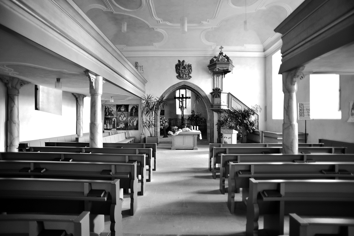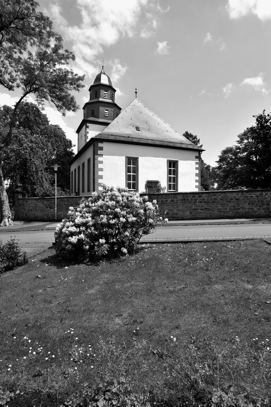 Der barocke Kirchenbau, 1721/25 durch den Hanauer Baumeister Joh. Christian Starck errichtet, erhebt sich mit dem gedrungenen spätgotischen Chorturm der Vorgängeranlage exponiert am südlichen Ende des Dorfs. Der Standort, dazu möglicherweise die Andeutung eines Grabens nördlich und die Bezeichnung Haingraben südlich des Kirchengeländes erinnern wohl an eine frühere Wehrfunktion des Kirchhofs, der heute eine fast quadratische Fläche einnimmt und ummauert ist. Zum Dorf hin öffnet sich die Mauer, das Portal wird eingefasst von schlanken genuteten Pfeilern, denen über profiliert auskragenden Abschlussplatten Kugeln aufsitzen. Teilweise ist die Mauerkrone mit Hohlziegeln eingedeckt. Der verputzte Chorturm der Kirche stammt im Erdgeschoss mit dem Chorraum noch aus der Mitte oder der zweiten Hälfte des 14. Jahrhunderts; er wird durch Gesimse dreigeschossig gegliedert und hat eine unregelmäßige Eckquaderung. Das erste Obergeschoss enthält eine Holzkonstruktion von 1452 (d), die einst der Unterstützung der durch den Glockenstuhl belasteten Balkendecke über diesem Geschoss diente. Sehr wahrscheinlich sind damals überhaupt erst die beiden Obergeschosse entstanden, deren Mauerwerk deutlich von dem des Erdgeschosses abweicht, etwas später gefolgt von der Anschaffung der im heutigen Geläut erhaltenen Glocke aus dem Jahr 1463. Das niedrige untere Geschoss zeigt nach Süden eine zugesetzte Pforte, sonst sind von außen keine originalen Öffnungen zu erkennen. Eine verschieferte zweigeschossige und achtseitige geschweifte Haube von 1721 (d) schließt den Turm ab. Das Kirchenschiff ist breiter als der Turm und längsrechteckig, es hat ebenfalls Eckquaderungen und wird durch hohe Rechteckfenster gegliedert. Jeweils ein Portal befindet sich in der Mitte der Nord- und der Westseite. Die Gewände der Portale sind aufwendiger profiliert als die der Fenster, und sie sind geohrt. An der Nordseite des Turms führt eine Freitreppe aus Sandsteinquadern zum hochgelegenen Emporeneingang in der Ostwand des Langhauses. Das Innere der Kirche besteht aus zwei Räumen: dem weiten und lichten Saal und dem anschließenden Chor. Der Saal schließt mit einem Spiegelgewölbe, das wie die Unterseiten der Empore geometrisch stuckiert ist. Die Empore an Nord-, West- und westlicher Südseite des Raums ruht auf wirkungsvoll schweren Rundstützen, die aus Holz und Stein bestehen und marmoriert sind. Die Emporenbrüstungen sind nicht wie sonst in der Region üblich kassettiert, sondern mit einem breiten, durchlaufenden Profil versehen. Auf dem Westabschnitt der Empore steht die Orgel aus dem Jahr 1729 von Orgelbauer Sterzing, Eisenach; das Werk wurde 1895 von der Firma Eifert, Stadtilm, neu eingebaut. An der Ostwand ist rechts neben dem Chorbogen die Kanzel angebracht. Sie ist verhältnismäßig schlicht; aufwendig tritt der mit ihr durch einen schmalen Profilrahmen verbundene baldachinartige Schalldeckel in Erscheinung. An zentraler Stelle oberhalb des Chorbogens prangt ein großes Wappen der Freiherren Riedesel, es ist dies der einzige figürliche Schmuck des Kirchensaals. Der schwere, spitze Chorbogen ist in die mächtige Wand wie eingeschnitten und hat an der Laibung geometrische Malereien wohl aus der Zeit um 1600. Den quadratischen Chor schließt ein Kreuzrippengewölbe; die schlicht gekehlten Rippen wachsen ohne Ansatz aus den Ecken des Raums und führen zu einem runden, mit einer Rose verzierten Schlussstein. Im Chor wurden seit 1927 Wand- und Deckenmalereien aus der Bauzeit des Turms freigelegt; sichtbar ist an der fensterlosen Nordwand eine große Marienkrönung, darunter Szenen aus dem Leben Johannes des Täufers und darunter eine Draperie. Aus der Barockzeit stammt in einem Gewölbefeld ein gemalter Verkündigungsengel. An Ausstattungsteilen befinden sich im Chor ein eindrucksvolles lebensgroßes Kruzifix aus der Bauzeit des Kirchenschiffs (1726 von Emanuel Ritter gearbeitet) und ein älterer Taufstein in flacher Kelchform, datiert 1594. Weitere Ausstattungsstücke, darunter ein Taufengel, befinden sich heute in Lauterbach (Hohhaus-Museum).