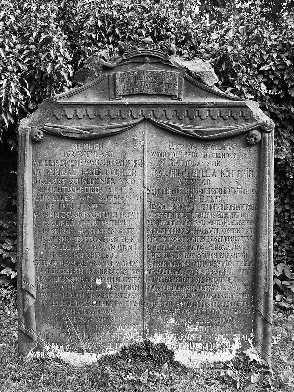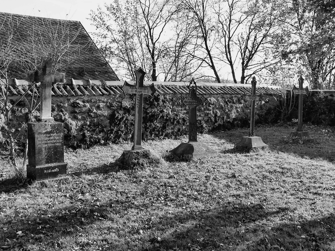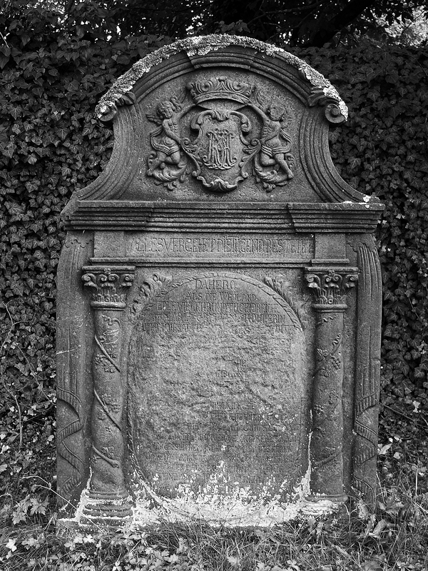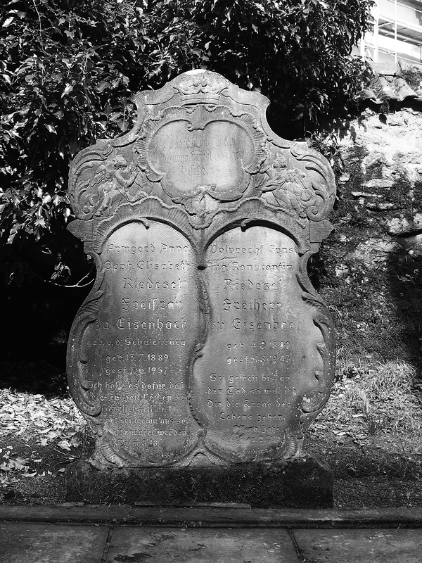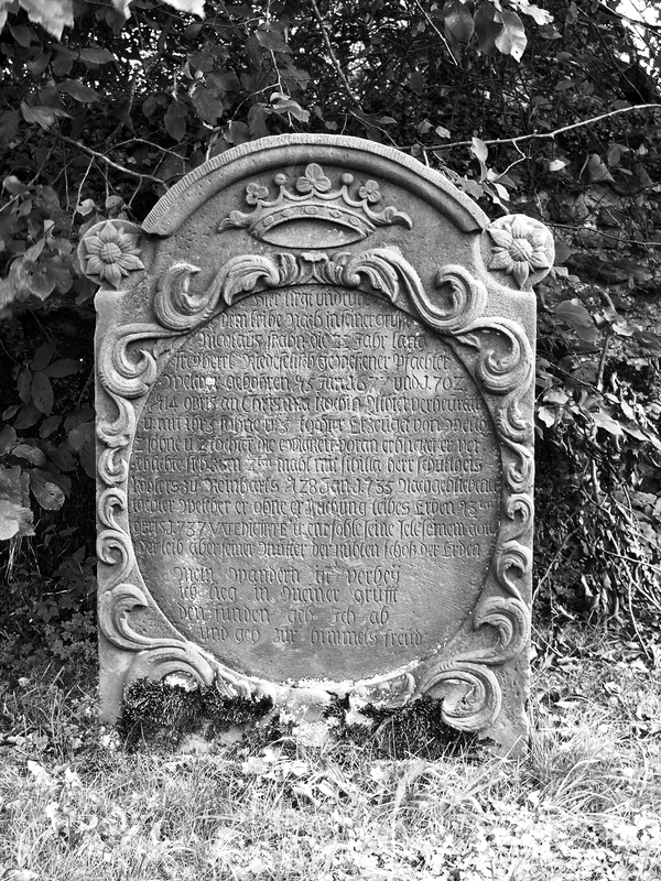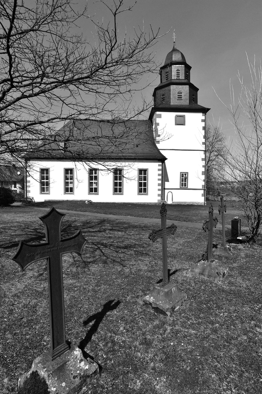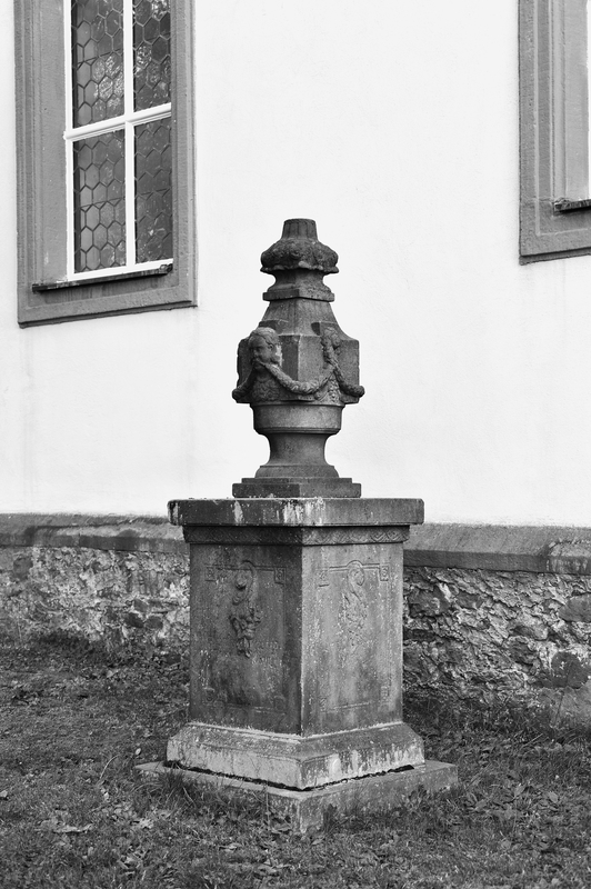 Auf dem Friedhof ist eine Anzahl barocker, klassizistischer und historisierender Grabmäler von auffallend guter Qualität erhalten geblieben. Sie haben orts- und regionalgeschichtliche, aber auch kultur- und kunstgeschichtliche Bedeutung. Die verhältnismäßig großen Stelen sind meist an Vorder- und Rückseite mit Ornamentik und Inschriften versehen. "WANDERER / SAÜME DICH ALLHIER, / UND BETRACHTE WIE IM LEBEN ALSO AUCH IM TODE UNGETRENNET SIND / DIE 43 JAHRE IN DER EHE VERGNÜGT GELEBT HABEN / DANN ES LIEGT ALLHIER VOR DIESEM STEIN, / HERR IOHANN CASPAR GEBHARD", so beginnt die ausführliche, im unteren Bereich leider verwitterte Inschrift für den "gewesenen Pfarrherrn" und seine Frau. Die hochovale Inschriftfläche ist an zwei gewundenen, von Weinranken umwachsenen Halbsäulen mit korinthischen Kapitellen aufgehängt. Die Säulen tragen ein Gebälk mit der Aufschrift "MEMENTO MORI", darüber zeigt ein Aufsatz das fein gearbeitete Relief zweier Genien (denen leider die Köpfe abgeschlagen wurden). Sie halten eine gekrönte Wappenkartusche mit Darstellung des seine Jungen fütternden Pelikans. Die Stele wird von einer schmalen Draperie gerahmt, die oben zu drei Knäufen gebunden ist. Auf der Rückseite befindet sich oberhalb eines stark abgeschieferten, langen und empfindsamen Gedichts ein Relief des Hermes (Merkur), Begleiter der Seelen in die Unterwelt, mit Stundenglas, Sense und Schriftband: "NEMINI PARCO" – Keiner bleibt verschont. Auch hier fehlt der Kopf. Das Gedicht beginnt denn auch: "WIE SEYD IHR MENSCHEN DOCH MEIST GAR ZU UNBESONNEN / BEY EURER OHNE DEM SO KURTZEN LEBENS FRIST ..." Die Stele für den 1735 verstorbenen Johann Balthasar Köhler, Organist, Schuldiener und Gerichtsschreiber, und seine Frau Anna Sibylla ist im Grunde hochrechteckig, schließt aber mit flachem Dreieck, dem zwei eine Krone haltende Engel aufliegen. Im Dreieck ein Schriftband: "HIER RUHEN ZWEY HERTZEN / DIE DOCH IM LEBEN NVR EINS WAREN / VOM TOD ZWAR GETRENNET ABER / AVCH WIEDER ZUSAMEN GEBRACHT". Die sehr ausführlichen Inschriften für Mann und Frau nehmen den wesentlichen Teil der Stelenfläche ein. Sie sind in der Mitte durch einen senkrechten Stab getrennt, werden aber durch eine schmale Draperie zusammengefasst, die an den Stelenecken über kleinen Totenschädeln verknotet ist. Einige der Details der Stele sind abgeschlagen. Nicolaus Spahn, gest. 1737, Pächter des riedeselischen Guts. Stele aus rotem Sandstein mit bogigem Abschluss, zu dessen Seiten akroterartige Erweiterungen mit Blütenreliefs versehen sind. Die ausführliche Frakturinschrift auf hochovaler Fläche ist aufwendig mit gerolltem Blattwerk eingefasst, darüber füllt eine Krone das Bogenfeld. Die gegen 1750 für Johann Conrad Horst errichtete Stele wird an den Seiten rocailleartig gerahmt und schließt über Akanthusvoluten mit einem eingezogenen geschweiften Bogen ab. Im Bogenfeld ist das Auge Gottes in Strahlen- und Wolkenkranz dargestellt, darunter folgt die Frakturinschrift. Auf der Rückseite steht der Leichentext in einer Rahmung aus Rankenwerk mit Blüten. Die für Jungfer Maria Christina Kohlerin errichtete Stele wurde etwa 1750 geschaffen. Ihre hochovale Inschriftfläche ist großenteils verwittert. Sie wird von korinthisierenden Halbsäulen mit Weinranken flankiert, die ein verkröpftes Gebälk tragen, darin die Inschrift "ALLES VERGEHET DIE TUGEND BESTEHET". Zu Seiten der Säulen Drapierungen, als Abschluss ein geschweifter Bogen mit dem Relief zweier Engel, die eine Krone und eine Kartusche mit den Initialen der Verstorbenen tragen. Elisabetha Catharina Gebhard, Pfarrersfrau, gest. 1755. Die Stele hat eine von Pilastern gerahmte Inschriftfläche, seitlich der Pilaster erscheinen Engelsköpfe mit ausladenden Flügeln. Die Stele schließt über waagerechtem Gesims kleeblattförmig, auf der Vorderseite des Aufsatzes halten zwei Engel Stundenuhren und ein Wappen mit Helmzier und Krone. Der 1755 verstorbene Lehrer Nicolas Köhler erhielt eine aufwendig ausgestaltete Stele aus rotem Sandstein. Sie wird durch zwei waagerechte Gesimse gegliedert und hat einen geschweiften Abschluss mit bekrönendem Pinienzapfen. Die Gestaltung der Ansichtsfläche nimmt darauf keine Rücksicht: Die hochformatige, durch Rocailles gerahmte Inschriftfläche überlagert die Gesimse, darüber halten zwei Engel zu Seiten eines Kelchs eine Drapierung auseinander. Auf der Rückseite rahmt Rankenwerk den Leichentext unter der Überschrift "PIETAS PULCHERRIMUM EPITAPHIUM!". Die Stele für Heinrich Theophil Sartorius hat einen bewegten Umriss, der von Voluten und einem eingezogenen, bogenförmigen Abschluss gebildet wird. Die Vorderseite ist durch dorische Pilas-ter gegliedert, über deren Kapitellen Rocailles zu einer abschließenden Agraffe hinaufleiten. Die Frakturinschrift erklärt: "Heinrich Theophil / Sartorius / gewesener Amtsschultheis / der beyden Gericht Mos und Freyensteinau / ist es / deßen am 7ten September 1770 [oder 1776?] eingefallene Leibeshütte /neben disem Stein / zur Ruhe niedergeleget ist." Es folgt ein ausführlicher Lebenslauf, der von besonderem historischem Interesse für die Region ist. Die Rückseite der Stele gibt den Leichentext ebenfalls in aufwendiger Rocaillerahmung. Die wohl 1779 entstandene Stele hat eine unleserlich gewordene Frakturinschrift. Ihr geschweifter, im unteren Bereich eingezogener Umriss ist der barocker ländlicher Grabsteine, die etwas unbeholfen platzierten und ausgearbeiteten Darstellungen (Auge Gottes, Drapierung, Wirbel, Voluten) wirken imitiert. Volkskundlich bemerkenswert aber sind die halbplastischen Darstellungen eines einzelnen Manns und einer Familie mit drei Kindern am unteren Rand unterhalb der Inschriften.(10) Kubisch gearbeiteter Grabstein auf profiliertem Sockel. Den erhabenen Inschriftflächen sind an den Unterkanten Guttae angehängt. Die Frakturinschriften des zu Anfang des 19. Jahrhunderts entstandenen Grabmals sind unleserlich.(11) Vor der Nordseite der Kirche steht das Grabmal 