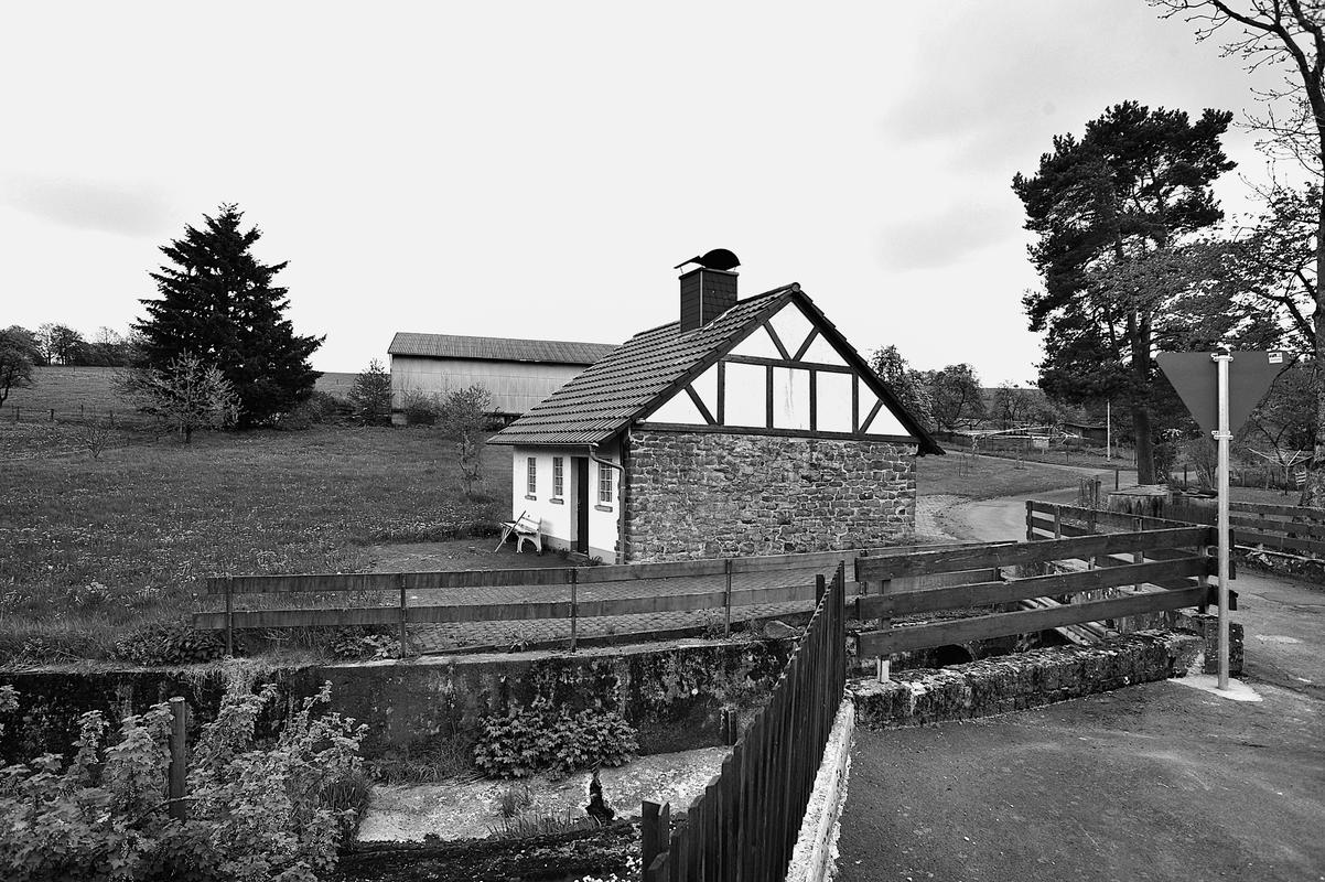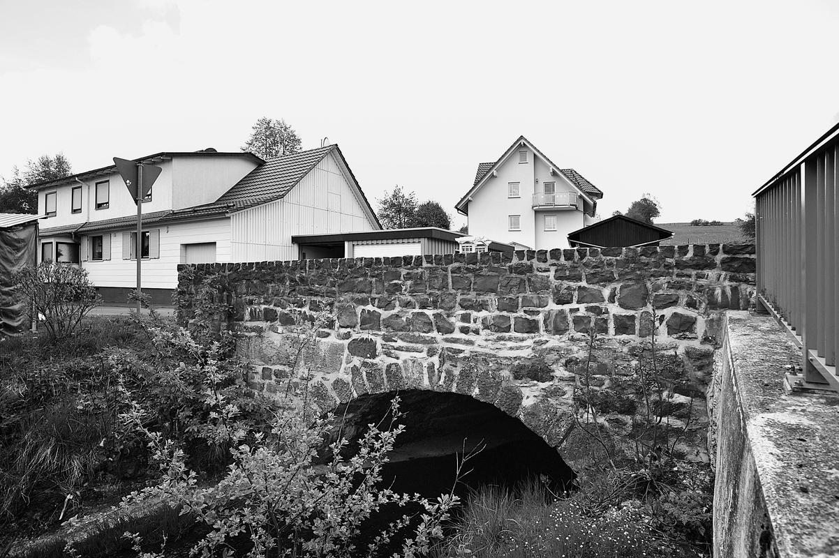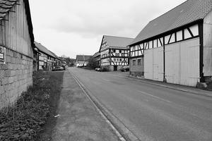 Bergstraße 1, 3, 5, 7 2, 4, 6Herbsteiner Weg 2An der heutigen Bergstraße, der Hauptstraße des Dorfs, ist eine Anzahl von Höfen errichtet, von denen insbesondere die Wohnteile bis in das späte 17. und frühe 18. Jahrhundert zurückreichen. Sie zeigen repräsentative Ausgestaltungen, wobei auch der sogenannte "thüringische Einschlag" mit der charakteristischen "absonderliche Verstärkung des oberen Wandteiles durch die Konsolbildung unter dem Brustriegel an Pfosten und Streben" (Heinrich Walbe) zur Geltung kommt (Bergstraße 3 und 7). Den schmalen Raum zwischen Straße und Eisen- beziehungsweise Schlitzbach füllen traufständige Streckhöfe, an der gegenüberliegenden nordwestlichen Straßenseite sind die älteren Wohnhäuser giebelständig errichtet und die Höfe konnten auch winkelförmig ausgebildet werden. Freilich hat die Entwicklung in der Landwirtschaft zu Verlusten und Veränderungen geführt, auch fehlt das geschichtlich und städtebaulich wichtige Element der alten Schule, das den oberen Abschluss des Straßenraums gebildet hat. Dennoch bilden die Höfe in ihrer dichten Stellung und mit ihren bemerkenswerten Fachwerken, die seit Beginn des 20. Jahrhunderts entdeckt und erforscht wurden, heute eine Besonderheit im regionalen Kontext und stellen eine zu schützende Gesamtanlage dar. Zu ihr zählt das stark veränderte Backhaus jenseits des Bachs und die am Beginn des Herbsteiner Wegs zur neuen Schule führende Basaltbrücke, die teilweise erneuert ist, auf deren Vergangenheit aber ein Stein mit der Datierung 1704 verweist. Gesamtanlage aus geschichtlichen Gründen.