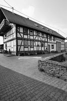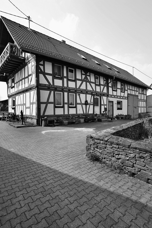 Ältester Teil des von der Straße zurückgesetzten fünfzonigen Streckhofs ist der Wohnteil, gekennzeichnet durch klassische Mann-Figuren im Obergeschoss. Das Erdgeschoss und die Fachwerkabschnitte der Wirtschaftszonen weisen jüngeres konstruktives Fachwerk auf. Den Eckständer des Wohnteils ziert eine stilisierte Säule mit Basis und Kapitell zwischen Pflanzenornamentik, Traube und Vogel. Die auskragende Stockschwelle ist mit einer teilweise verschliffenen Inschrift versehen, die außer dem Bauherrn und seiner Frau (Johannes und Elisabeth Voltz) den Zimmermeister Johannes Rausch aus Allmenrod nennt, der um 1800 tätig war. Das Haus bleibt abgesehen von einem überdimensionierten Giebelausbau ein schönes Beispiel der Gattung Streckhof.