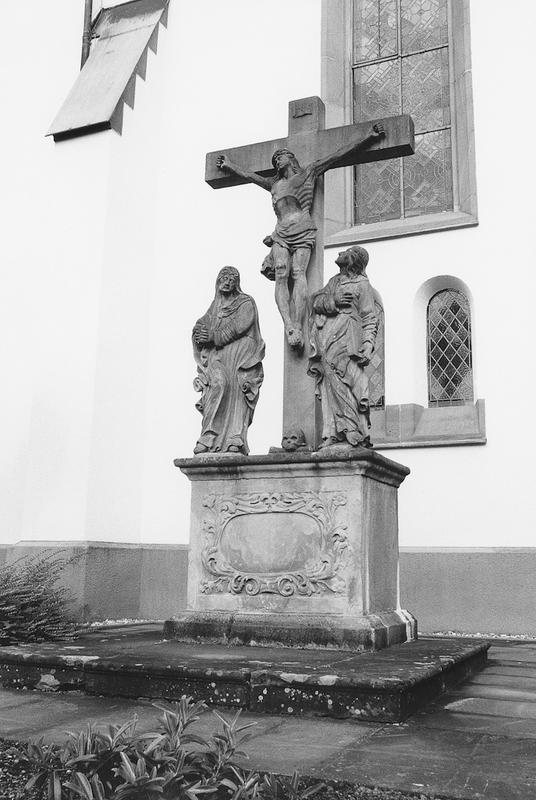 An der Westseite der Kirche barocke Kreuzigungsgruppe von Anton Wermerskirch, 1710. Bewegte Figurengruppe aus Sandstein auf einem rechteckigen Sockel mit floral gerahmter Kartusche.