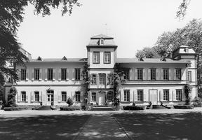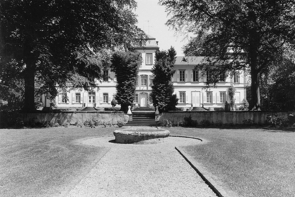 Schloss: Zwischen 1861 und 1928 entstandener, breitgelagerter, zweigeschossiger Putzbau in neobarocken Formen mit zwei turmartigen dreigeschossigen Seitenrisaliten und einem dreigeschossigen Mittelrisalit, dem ursprünglichen barocken Gartenhaus von 1748, das 1865 um ein 2. Obergeschoss erhöht wurde. Die schmalen, dreigeschossigen Bauglieder sind mit barocken Mansarddächern, die jeweils fünfachsigen, zweigeschossigen Zwischenglieder mit flach geneigten Satteldächern gedeckt. Der westliche Flügel wurde 1884 angebaut und im Eingangsbereich 1926 erweitert. Der schlichte Baukörper wird horizontal durch umlaufende schmale Simsbänder in den Geschoßhöhen und Fensterbrüstungen gegliedert, vertikal werden alle Bauglieder durch eine Eckquaderung in Sandstein betont. Die hochrechteckigen, zweiflügeligen Fenster in Sandsteingewänden werden mit Klappläden geschlossen. Ausgenommen sind hiervon die Obergeschosse des Mittelrisalits.