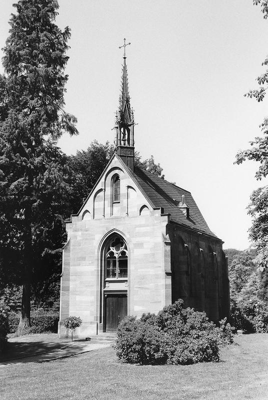 Schloßkapelle mit Familiengruft: Neugotischer kleiner Saalbau aus Sandsteinquadern mit polygonalem Chorschluss im Westen, Satteldach und schlankem Dachreiter über der Fassade, 1866 von Ignatius Statz aus Köln erbaut. Gliederung des Außenbaus durch Scheinarkaturen im Giebel und Strebepfeilern an den Seiten. Erschliessung über zweiflügelige Eingangstür in der Fassade mit in die Türnische integriertem großen Maßwerksfenster. Innenraum mit Kreuzgratgewölbe und neugotischen Kapitellen, in den Buntglasfenstern Darstellung der Geheimnisse des Rosenkranzes. Auf dem Altartisch ein frühgotisches Kreuz aus speckstein. Unter der Kirche die Gruft der Familie von Savigny.