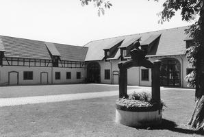 Wirtschaftshof: Südwestlich an den Schloßpark angrenzende rechteckige Anlage mit zwei symmetrisch angeordneten Verwalterhäusern von 1730 und zwei langgestreckten ehemaligen Wirtschaftsbauten ebenfalls aus der Mitte des 18. Jahrhunderts. Ursprünglich waren beide Wohnhäuser zweigeschossige fünfachsige Putzbauten mit Fenstergewänden, Eckquaderungen und horizontalen Geschossgesimsen in Sandstein, einer Erschließung über eine Freitreppe und einem geohrten Sandsteinportal in der Mittelachse. 1865 wurde aber das barocke Krüppelwalmdach des westlichen Gebäudes abgebrochen und ein Geschoss aufgesetzt. Das neue, flach geneigte Walmdach verleiht dem barocken Bau seither einen spätklassizischen Anschein.