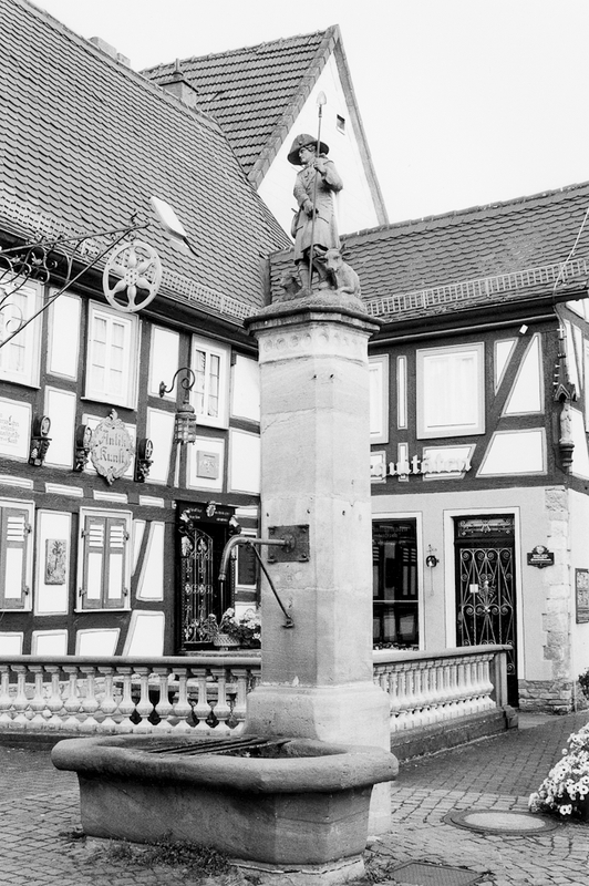 Sandsteinlaufbrunnen um 1800. Sandsteinpfosten auf Postament. Kapitell mit Statue des Heiligen Wendelinus in Pilgerkleidung, zu seinen Füßen Rind und Lamm. Länglicher, oktogonaler Rinntrog aus Sandstein.