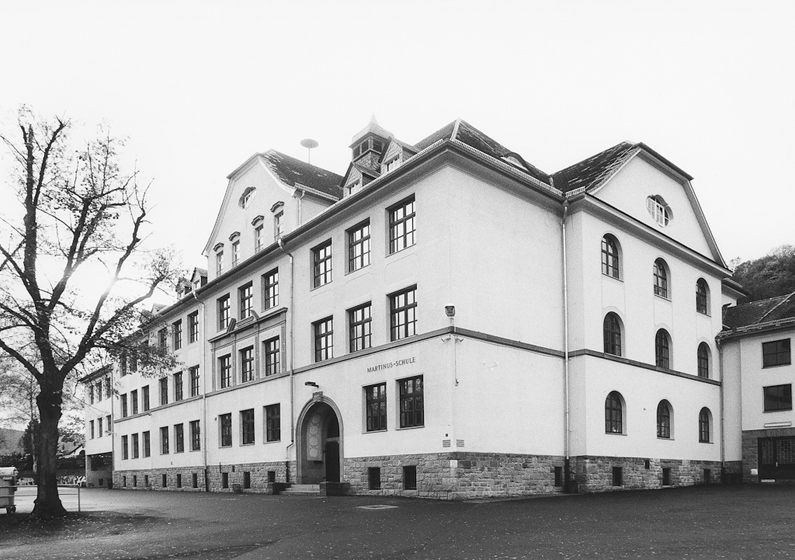In beherrschender Lage auf einem Plateau oberhalb der Martinskirche gelegener, repräsentativer Schulbau in leicht barockisierenden Formen, als Volksschule in den Jahren 1908-1910 errichtet, Einweihung 1911, Erweiterungsbau 1952. Dreigeschossiger Putzbau auf rustiziertem Sandsteinsockel mit flachem Seitenrisalit. Sparsame Gliederung der Wandflächen im ersten Obergeschoss durch ein Brüstungsband und barockisierender Rahmung der mittleren drei Fenster in Sandstein. Im Erdgeschoss in der Seitenachse ein großes, rundbogiges Doppelportal mit Kartusche im Schlussstein. Fenster mit Oberlichtern und Sprossengliederung, im giebelseitigen Risalit mit Rundbogenabschluss, die Giebel der Zwerchhäuser von querliegenden Okuli belichtet. Im Inneren Treppenhaus mit originalem Eisengeländer erhalten, in der Eingangszone Gemälde, das die Gründung des Kinderhospitals zum Thema hat. Sowohl die originalen Eichentürblätter mit abgeschrägten oberen Ecken, Kassetten, Lichtausschnitten, geschmiedeten Beschlägen und Gittern, als auch die Verglasung des Oberlichts und die Schuluhr sind erhalten. Reich gegliederte Dachlandschaft aus Walmdach, großen Zwerchhäusern unter Krüppelwalmdächern, stehenden spitzgiebeligen Gauben und dem zeittypischen Dachreiter mit Welscher Haube. Nördlich, zurückversetzt, späterer zweigeschossiger Turnhallenanbau auf einer Sandsteinarkade. Schöner Schulbau am Übergang vom Historismus zum Heimatschutzstil.
