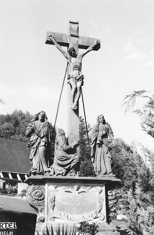 Dominiert wird der Friedhof von einer barocken Kreuzigungsgruppe, die 1844 vom Kirchhof St. Martin hierher transloziert wurde. Qualitätvolle Kreuzigungsgruppe von 1708 in Sandstein. Auf einem reich mit Voluten und einem Putto verzierten Prozessionsaltar ein hohes Kruzifix, flankiert von Maria und Johannes, am Kreuzesfuß die kniende Maria Magdalena. In der Mensa Inschriftenplatte "Jesu dem gekreuzigten zu allerhöchster Ehren / hat herr Philipp Kunkel desz Raths dahier und Anna / dessen Eheliche hausfrau dieses Kreutz bilde auffrichten/ undt zugleich den hochen altar in allhiesiger Pfarrkirchen / vergoldten laszen im Jahr 1708." (g,k) Einige repräsentative Grabstätten aus der 2. Hälfte des 19. Jahrhunderts und den ersten beiden Jahrzehnten des 20. Jahrhunderts sind erhalten.