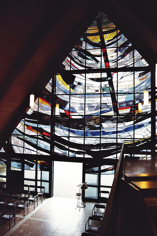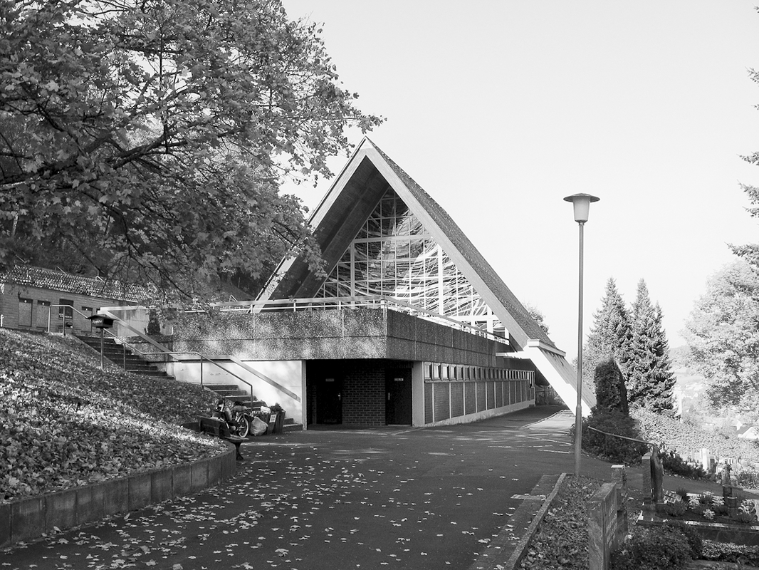 Auf einem künstlichen Plateau hoch am Hang gelegene große Trauerhalle, 1967- 69 nach Entwürfen der Architekten Emil Weißbecker und Walter Dieringer errichtet. Ausführung durch das Architekturbüro Paul Dehmer, alle aus Bad Orb. Auf einem gewaltigen Sockelgeschoss mit integrierter Terrasse eine hohe Satteldachkonstruktion als Trauerhalle, die talseitig vor dem Sockelgeschoss auf Betonsparren ablastet. Die Substruktion wurde ebenso wie die nördliche Giebelwand aus Beton mit Klinkerflächen, der südliche Giebel mit den Eingangstüren komplett als Stahlkonstruktion mit einem mehr als 67 qm großen Glasgemälde ausgeführt. Der Entwurf zu dem Glasfenster stammt von dem Maler, Farbglasgestalter und Mosaizisten August Peukert aus Groß Auheim, der zu den bedeutendsten Nachkriegskünstlern des Kreises zählt. Die Glaserfirma H. B. Gossel aus Urberach führte die Stahlkonstrukion und die Glasmalerei 1968 aus. Im Inneren beherrscht ein großes Mosaik mit einer farbenprächtigen Darstellung der Auferstehung Christi den Raum. Das Mosaik wurde ebenfalls von August Peukert entworfen und auch von ihm ausgeführt. Eine außergewöhnlich beeindruckende Trauerhalle, die nicht nur dank ihrer künstlerischen Gestaltung aus dem Rahmen der üblichen Friedhofsbauten herausragt. (g,k)