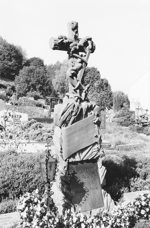 Grabkreuz aus Sandstein um 1897 in sehr naturalistischen Formen: Aus einem Podest in Form eines zerklüfteten Felsens wächst ein Baumkreuz. Statt einer Christusfigur schmiegen sich ein Rosenast, und ein flammendes Herz an das Kreuz; darüber hängt am rechten Kreuzarm an einem Seil ein Anker - alles zusammen das Symbol für "Glaube, Hoffnung und Liebe". Am Sockel eine aufgewickelte Schriftrolle, vor dem Sockel eine Bronzeplatte mit den Namen der Familie Freund. Neben der Schriftrolle ist nicht mehr lesbar der Name des Aschaffenburger Bildhauers eingehauen. Evtl. derselbe Künstler hat ein sehr ähnliches Kreuz in Lanzingen geschaffen. (k)