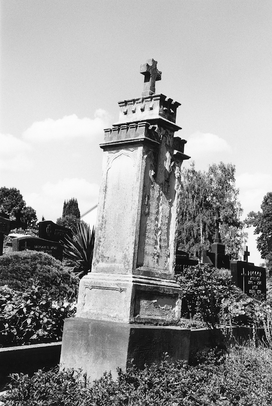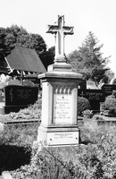 Neogotisches Grabkreuz von 2,50 m Höhe. Das kräftige Postament pfeilerartig mit Maßwerkschmuck und Zinnenkränzen alsAbschluss. Starke Verwitterung. (g,k)