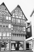 Die schmale Disposition des Hauses mit dem hohen, massiven Erdgeschoss, dem steilen Dachgeschoss mit Kran- und Ladeluken sind noch spätgotisch. Im Erdgeschoss Kellereingang, darüber im Wappenstein das Mainzer Rad.