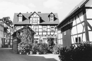Hofreite des 18./19. Jahrhunderts in Ecklage, bestehend aus giebelständigem Wohnhaus mit massivem Erdgeschoss Fachwerkobergeschoss, Satteldach und Zwerchhaus sowie einem zur Straße traufständigem schmalen Stallgebäude, ebenfalls Fachwerk über massivem Erdgeschoss, und einer Fachwerkscheune.