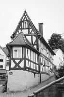 Das als "Kleinstes Haus Hessens“ bekannte und wohl meistfotografierte Haus Orbs. Zweistöckiges Fachwerkgebäude mit eingeschossigem Anbau aus dem 17. und 18. Jahrhundert auf einem spitzdreieckigem Grundstück am Hang des Kirchberg. Es endet in einer stumpfen Spitze von 1,58 m Breite am Aufgang zur ehemaligen Fischborner Burg. Kräftiges Fachwerkgefüge mit Andreaskreuzen, Kopfbändern und Zahnschnittband auf abgestuftem Kellersockel mit separatem Eingang, einhüftige Freitreppe (modernisiert), Satteldach mit Aufschiebling am Haupthaus, Walmdach auf dem kleinen Anbau.