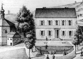 1821/22 als königlich bayerisches Landgericht erbaut, diente das Amtsgebäude später auch als preußisches und hessisches Amtsgericht. Es gehört zur Gruppe der "bayerischen“ Gebäude, die unter König Ludwig I. erbaut wurden. Der ursprünglich fünfachsige und zweigeschossige Bau wurde 1864 um je drei Fenster auf elf Achsen erweitert. Achsensymmetrischer Putzbau auf Sandsteinsockel, horizontale Gliederung durch Stockwerks- und Sohlbankgesimse, zweiflügelige Rundbogenfenster mit Klappläden, schlichtes Satteldach. Erschließung in der Mittelachse über kleine Freitreppe und zweiflügelige Tür in Sandsteingewände mit Verdachung auf Konsolen. Da die bayerischen Gebäude in Orb im allgemeinen aus Sandstein errichtet wurden und unverputzt blieben, ist anzunehmen, dass auch das Gericht erst nachträglich verputzt wurde. Im ehemaligen Sitzungssaal ein großes Wandgemälde als Seccomalerei auf Putz aufgetragen, 1958 geschaffen von Maler Markard im grafischen, abstrahierenden Stil der fünfziger Jahre. Breite: 5 m, Höhe: 3,30 m. Die Thematik des Bildes beschäftigt sich mit der Rechtsprechung: rechts zwei Richter in Roben, 1 Beisitzer hinter einem Schreibtisch mit Tintenfass und Feder. Links im Bild eine gebeugte, kniende Frauenfigur und Justitia mitSchwert, welche die Arbeit der Richter überwacht. Aus der Bauzeit sind Kassettentüren mit originalen Langbändern erhalten.
