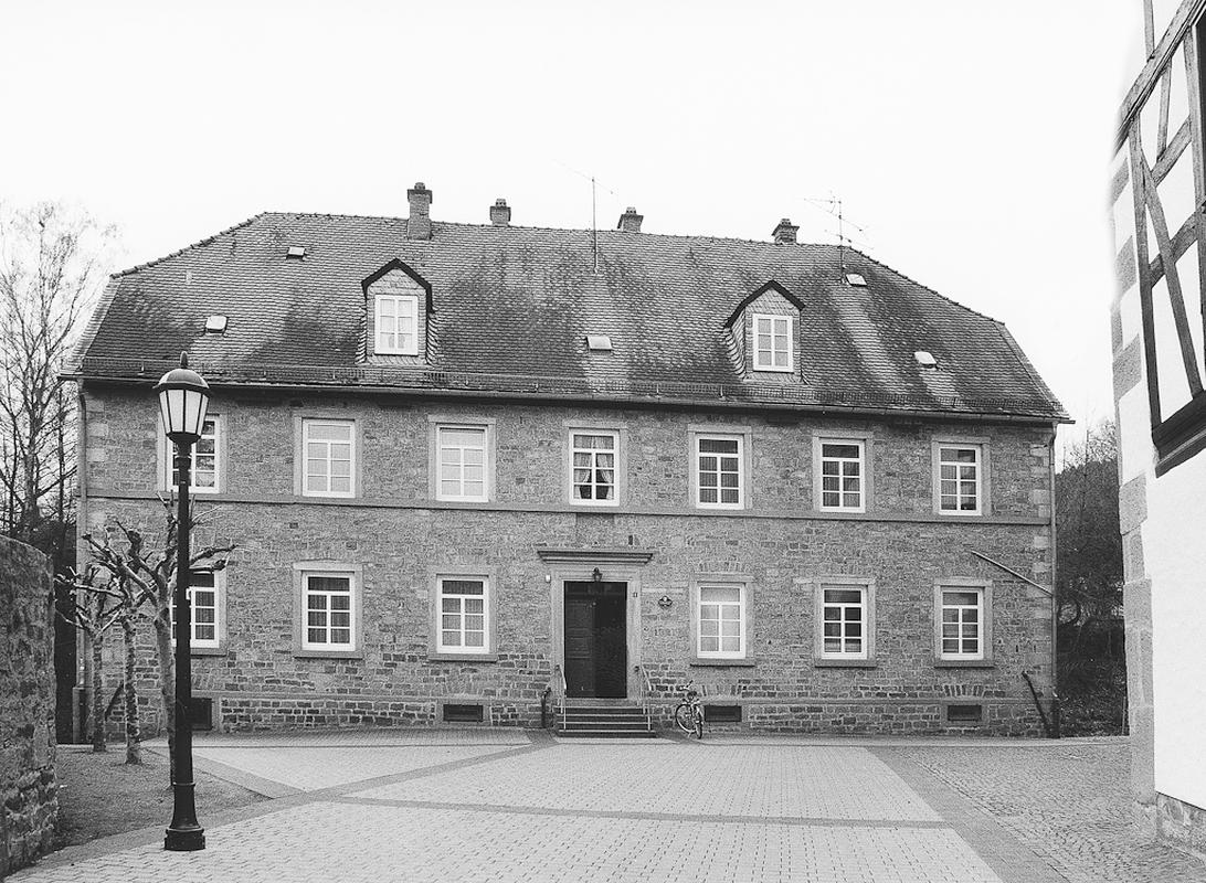 Alte Stadtschule von 1838. An dieser Stelle bestand etwa seit 1600 eine Schule. Der Wächtersbacher Chronist Anton Calaminus berichtet, dass im Jahre 1833 eine größere Reparatur an dem alten Schulhaus an der Stadtmauer notwendig geworden war. Statt dieser aufwändigen Sanierung wurde dann ein neues Schulhaus geplant. Landbaumeister Spangenberg aus Steinau entwarf ein zweigeschossiges massives Schulgebäude mit zwei Klassenräumen im Erd- und zwei Lehrerwohnungen im Obergeschoss. Er kalkulierte die Kosten für den Bau in einer für uns unvorstellbaren Genauigkeit auf 5148 fl. 58 1/4 Kreuzer. Calaminus erwähnt in seinem Bericht, dass 1836 auch eine Mädchenklasse eingerichtet werden sollte. Um aber sowohl die Volksschule, die "Teutsche Schule“, als auch die "Lateinschule“ mit einer zusätzlichen 4. Klasse in dem Gebäude unterbringen zu können, wurde 1837 ein neuer Plan mit 4 Klassenräumen und 3 Lehrerwohnungen entworfen. Die Baukosten wurden jetzt auf 5738 fl. 30 kr. veranschlagt. Bis 1838 wurde dann im alten Schulgebäude weiter unterrichtet, bis es für den Neubau weichen musste und auf Abriss für 381 fl. 40 kr. verkauft wurde. Die Mädchen wurden vorübergehend im Rathaussaal, die Jungens in dem herrschaftlichen Bedientenstuhl in der Kirche unterrichtet. Die Lehrer wohnten in dieser Zeit in Privathäusern. Im März 1838 begann man mit dem Bau. Alle Gewerke wurden an Handwerker aus Wächtersbach vergeben. Die Arbeiter kamen aus den umliegenden Orten. Die Stadtmauer wurde teilweise abgetragen, der Kalk und die Ziegel kamen von der Weilerser Ziegelhütte und aus Steinau, der Lehm aus der Gemarkung, das Holz aus den umgebenden Waldungen sowie aus Hanau und das Eisen aus Neuenschmidten. Die Arbeitskosten betrugen 4549 fl. Alle Transporte wurden von den Einwohnern der Stadt übernommen. Mit Ausnahme der Sandsteine und des Schiefers lieferte die Stadt alle Materialien. Am 19. August 1838 fand die feierliche Grundsteinlegung statt. 1847 wurde die Schule eingeweiht. Obwohl die Kurfürstliche Regierung in Hanau großes Verständnis für die Dringlichkeit des Schulneubaus zeigte, musste die Stadt Wächtersbach im wesentlichen alleine die Kosten tragen - statt der zugesagten Hilfe von 1000 fl. zahlte die Regierung nur 500 fl. in zwei Jahren. Daraus resultiert wohl auch die lange Bauzeit.