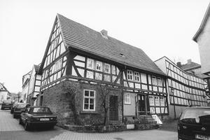 Eckständiges, zweigeschossiges Doppelhaus in Sichtfachwerk unter gemeinsamen Satteldach mit Aufschiebling. Westliches Haus mit Fachwerkobergeschoss auf massivem Erdgeschoss aus Sandstein. Kräftiges Sichtfachwerk mit Mannfiguren an den Eckständern, datiert 1740. Reihung von drei Fenstern in originaler Größe hat sich erhalten. Die Fachwerkform weist auf eine ältere Entstehungszeit.