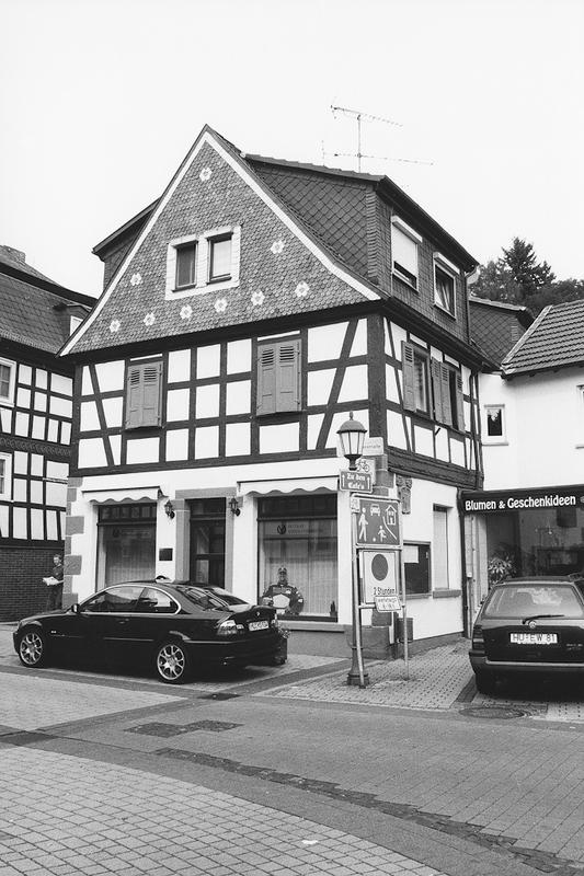 Zweigeschossiges Gebäude in markanter Lage. Auf massivem Erdgeschoss mit kräftiger Eckquaderung ein leicht auskragendes Obergeschoss in konstruktivem Fachwerk mit profilierter Rähm. Satteldach mit Aufschiebling und verschiefertem Giebel
