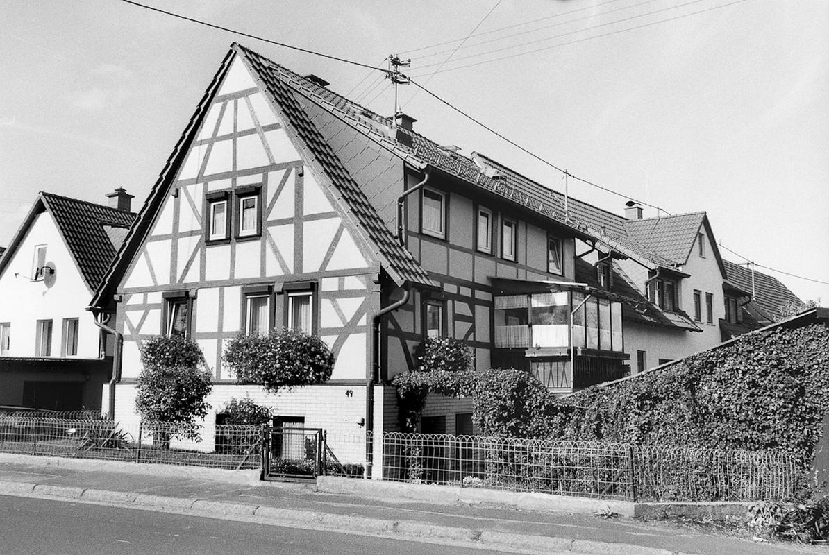 Eingeschossiges, giebelständiges Wohnhaus über hohem Kellersockel mit Scheune. Hohes Dachgeschoss unter steilem Satteldach später. Das Fachwerk des Erdgeschosses mit den kräftig gebogenen Diagonalstreben an den Eckständern lässt eine Datierung vor 1800 zu, wurde später aber verändert.