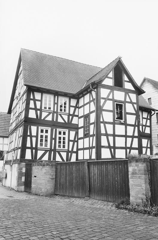 in der sichtachse des östlichen Abschnitts der Frankfurter Straße giebelständiges, repräsentatives Wohnhaus aus der Mitte des 18. Jahrhundert auf hohem, verputztem Sockel mit Eckquaderung aus Sandstein, Satteldach mit Aufschiebling. Zwei Geschosse in Sichtfachwerk mit profiliertem Schwellenkranz, Doppelständern und negativen Rauten in den Brüstungsfeldern im Obergeschoss. Im Dachgeschoss wurden moderne Fenster eingesetzt. Traufseitig späterer zweigeschossiger Anbau auf Sockel aus Sandsteinquadern mit Satteldach und Aufschiebling.