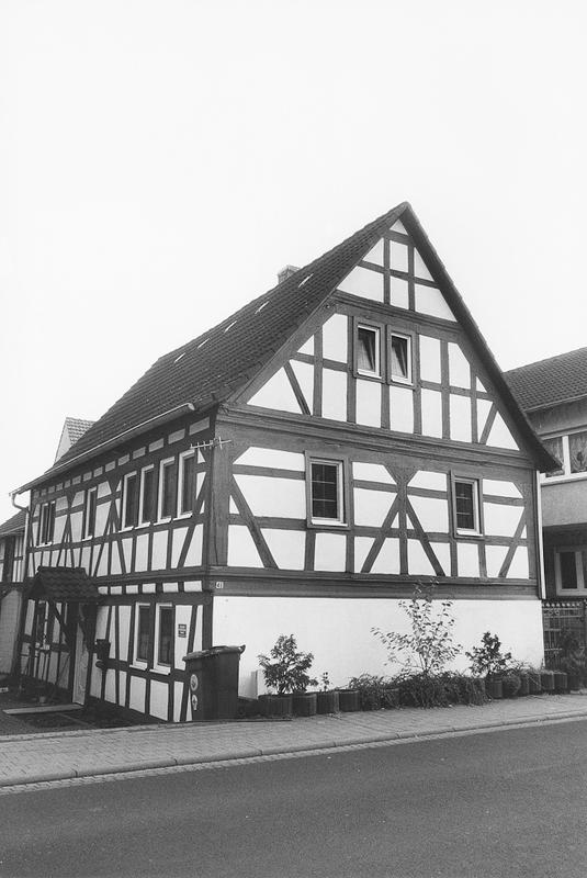 Vom Straßenniveau aus tiefer liegendes, zweigeschossiges, und giebelständiges Wohnhaus um 1700. Auf niedrigem Sockel zwei Geschosse in Sichtfachwerk mit Mannfiguren ohne Gegenstreben und profilierten Schwellen, Satteldach mit Aufschiebling und profilierter Rahmung. Erdgeschoss straßenseitig massiv. Erschliessung in der Traufseite.
