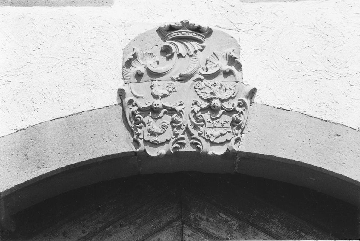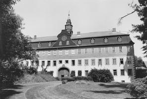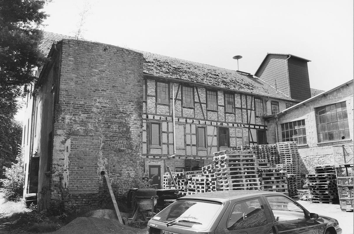 Hofseitig geschwungene Freitreppe, im Inneren schöne Eichentreppe. Nebengebäude: Wohnhaus 1. Hälfte 18. Jh., verputztes Fachwerk, zweigeschossiger Mittelbau zwischen eingeschossigen Seitentrakten unter Mansarddächern. Seitlich angeordnet verschiedene Wirtschaftsbauten des 18.-20. Jahrhunderts.
