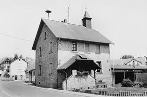 In Dorfmitte giebelständiges, ländliches Schulhaus um 1850. Wie zahlreiche öffentliche Gebäude dieser Zeit Massivbau aus Sandsteinquadern, zweigeschossig auf Kellergeschoss, vorkragendes Krüppelwalmdach mit rechteckigem Dachreiter und kleinem, spitzen Helm. Traufseitig Erschliessung über zweiläufige Außentreppe unter abgewalmtem Vordach. Gliederung des Baus traufseitig in drei, giebelseitig in zwei Achsen durch Fenster mit schlichten Sandsteingewänden.