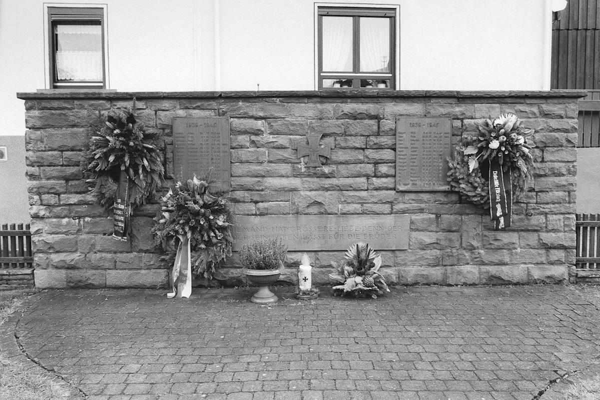 Den Abschluss des dreieckig eingefassten Platzes an der Südseite bildet das Kriegerdenkmal für die Gefallenen des 2. Weltkrieges in Form einer rustizierten Sandsteinmauer mit eingelassenem Schriftband "Niemand hat grössere Liebe denn der der sein Leben lässt für die Brüder“. Im zentralen oberen Bereich ist ein Eisernes Kreuz aus Bronze eingelassen, flankiert von zwei bronzenen Namenstafeln.