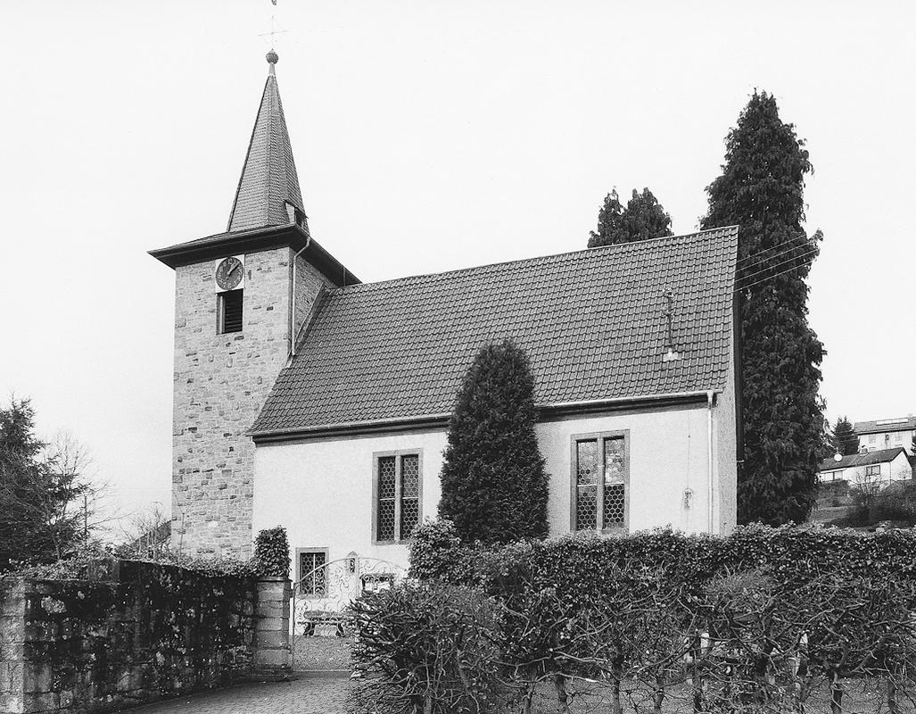 Oberhalb der Orber Straße leicht erhöht inmitten des Kirchhofes gelegene, im Kern spätgotische Saalkirche aus dem 16. Jahrhundert. Schlichter, mehrfach veränderter Putzbau, u.a. wurden die Kreuzstöcke aus den Sandsteingewänden der Fenster herausgebrochen. Der massive Frontturm in unverputztem Bruchstein mit spitzem Helm wurde von Maurermeister Wilhelm Henß in den Jahren 1920-23 erbaut.