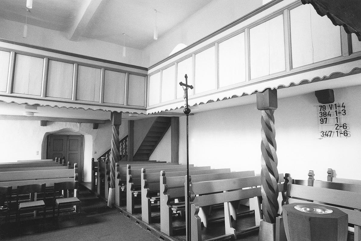 Im Inneren zweiseitige Empore. Aus der Erbauungszeit Sandsteinkanzel mit hanauischem Wappen erhalten.