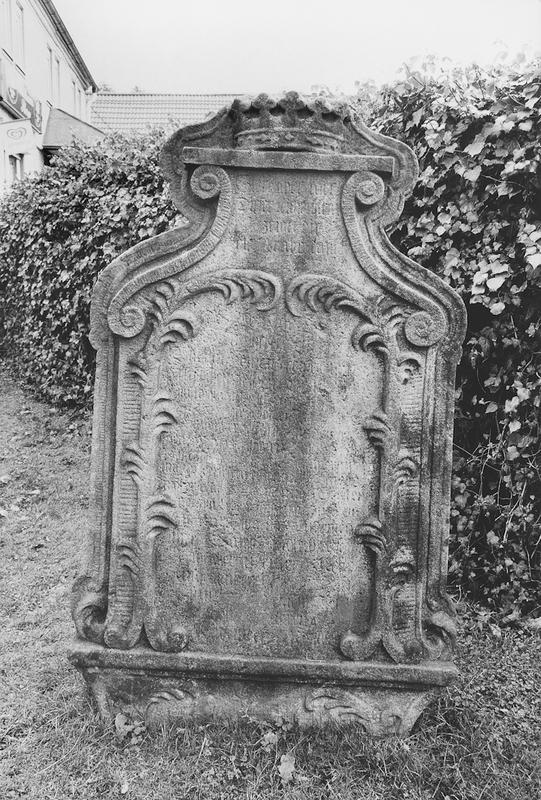 Barocker Grabstein aus Sandstein, stark verwittertes Schriftfeld von Astwerk gerahmt und von fünfzackiger Krone bekrönt, vermutlich Grabstein eines Pfarrers. In der Form identisch mit den Grabsteinen in der Kirche Lohrhaupten.