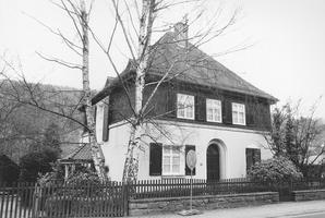 Kleine Villa aus dem Anfang des 20. Jahrhunderts auf gut eingewachsenem Grundstück in Formen des Heimatschutzstils. Massivbau mit verschindeltem Fachwerkobergeschoss unter hohem Pyramidendach. Zentraler, rundbogiger Eingang mit gerundetem Sandsteingewände. Originale Tür, Fenster und Läden erhalten.