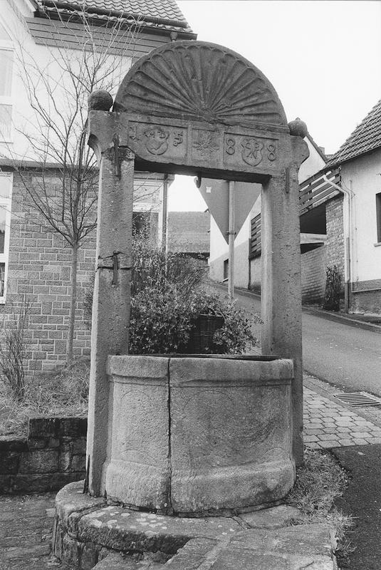 Ziehbrunnen von 1588 aus Sandstein mit scheibenförmiger, halber Rosette, flankiert von zwei Kugeln als Aufsatz auf dem Brunnengestell.