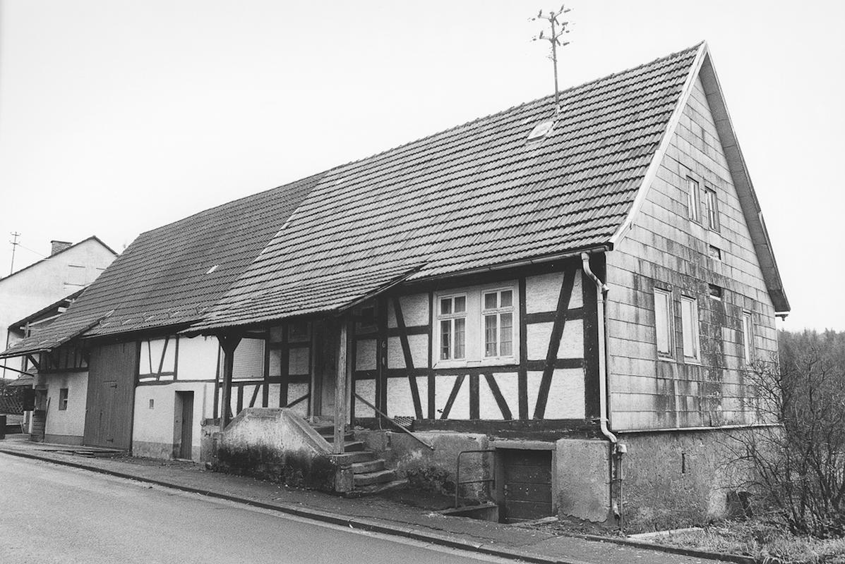 Traufständiger Streckhof aus dem frühen 19. Jahrhundert. Eingeschossiges Wohnhaus auf Kellergeschoss aus Sandstein, Obergeschoss in einfachem Sichtfachwerk, Satteldach mit Aufschiebling. Erschliessung traufseitig über zweihüftige Treppe, darüber Schleppdach. Anschließend Stallscheune mit niedrigem massiven Erdgeschoss, darüber Fachwerkdrempel. Großes Einfahrtstor. Angeschlepptes Satteldach.