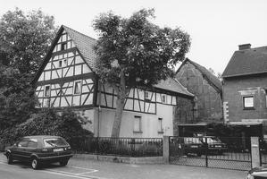 Zweigeschossiges, giebelständiges Einhaus um 1800 auf niedrigem Sockel unter Satteldach mit Aufschiebling. Das Erdgeschoss mit modernem Isolierputz, das Obergeschoss in Sichtfachwerk aus schmalen Hölzern mit Lauterbacher Mannfiguren an der Traufseite und den Eckständern. Traufseitige Erschliessung über sehr schöne, bauzeitliche zweiflüglige Kassettentür mit Rauten, geschnitzten Rosetten, Zahnschnittbändern am Stock und Oberlicht. Das Holztürfutter wird von schmalen Pilastern gerahmt. Massiver Stallteil aus Sandstein, im Obergeschoss aus Ziegeln.