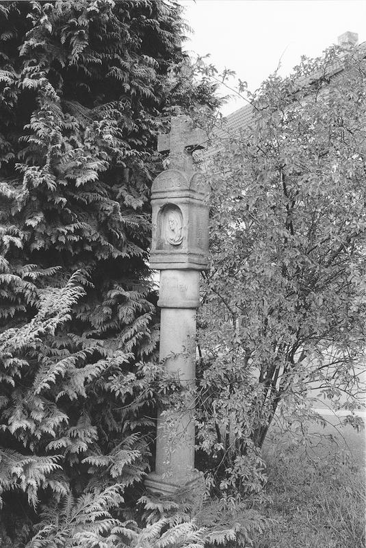 Ca. 1,60 m hoher Bildstock von 1736 aus Sandstein. Auf dem tief in den Boden eingesunkenen Postament runder Schaft mit Halsring, vierseitige Laterne, darauf ein Kreuz. An der Vorderseite flache Nische mit Brustbild einer Madonna, wohl um 1900 nachträglich angebracht.