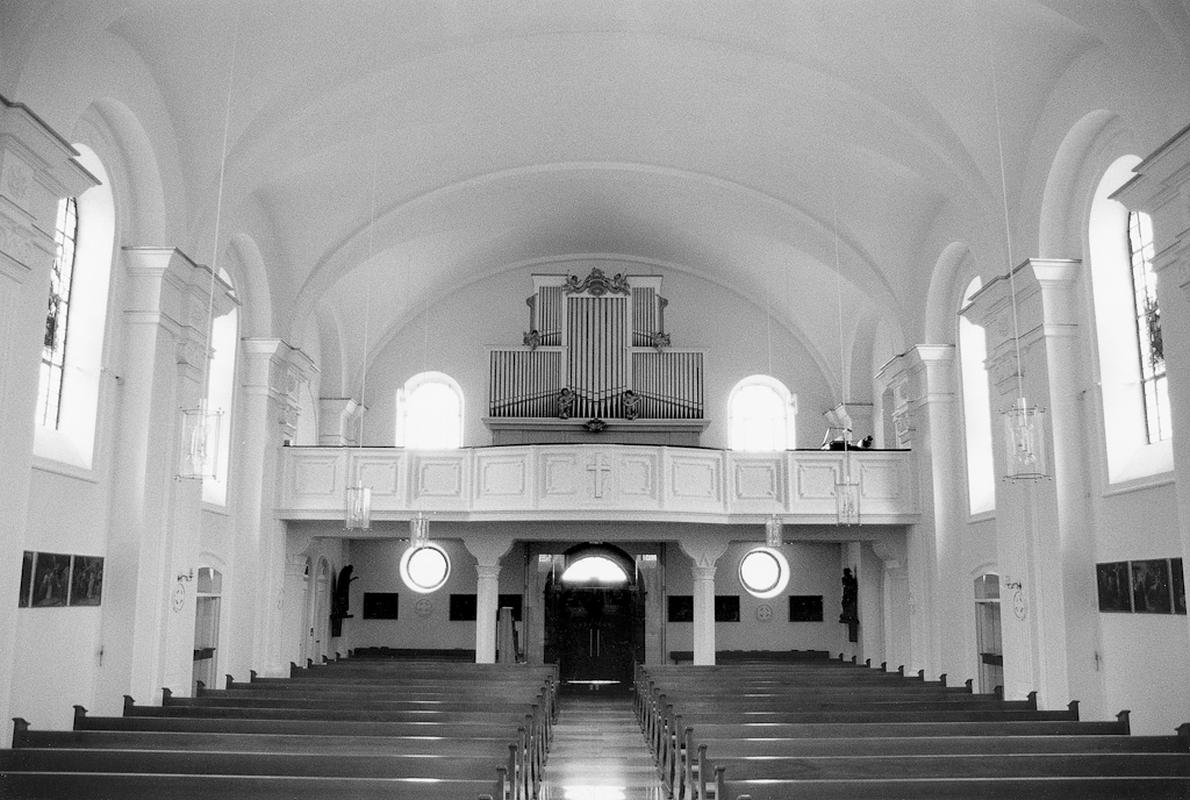 Breitgelagertes, kreuzgratgewölbtes Schiff mit tief eingezogenen Stichkappen, Gurtbögen auf Wandvorlagen mit modifizierten ionischen Kapitellen; eingezogener Chor mit 5/8 Schluss. Qualitätvolle neobarocke ausstattung vollständig erhalten. Buntglasfenster mit Szenen aus dem Neuen Testament und dem Leben des Heiligen Michael. Im chor bewegte Kreuzigungsgruppe, die Figur des hl. Michael auf dem linken Seitenaltar, die Pietá in der Seitenkapelle, Kanzel und Orgelprospekt von Bildhauer H. Wohlfahrt, Steinheim. Auf dem südlichen Seitenaltar qualitätvolles Altarbild, "Himmelfahrt Mariä" (17. Jh.) aus Ober-Medlingen (Bayern).