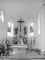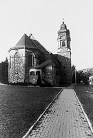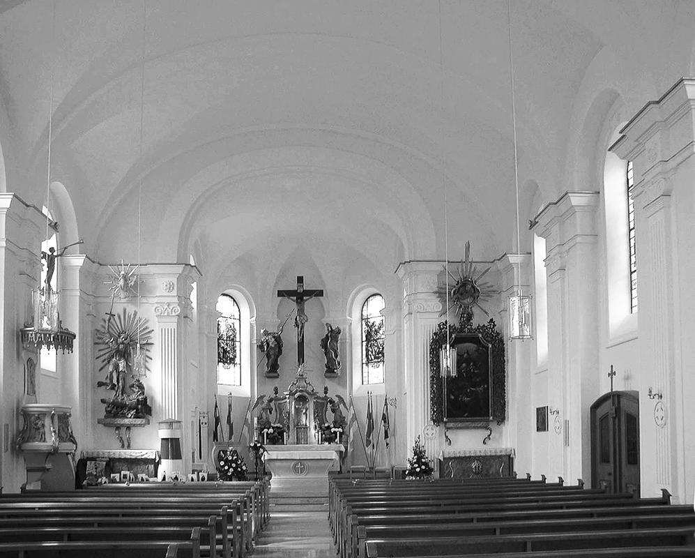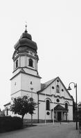 Oberhalb des alten Dorfkerns Saalkirche von 1924/26 mit kleiner Säulenvorhalle in historisierenden Formen. An der Nordwestecke kräftiger Turm mit hoher Laterne und gedrungener, zweistufiger Haube. Westfassade symmetrisch gegliedert durch Simsbänder, Rundbogen- und Okulusfenster, am Giebel rundbogige Nische mit Figur des Heiligen Michael. Originale Eingangstür aus Eichenholz mit kanneliertem Mittelschlag, Blüten und halbrundem Oberlicht mit strahlenförmigen Sprossen.. Südlich Sakristeianbau. Der Bau wurde als unverputzter Bruchsteinbau errichtet und erhielt erst anläßlich der letzten Renovierung 1997-2000 einen schützenden Verputz.