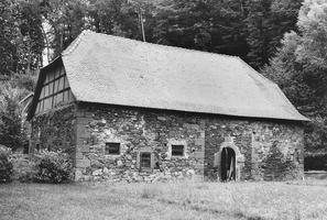 Ehemalige Zehntscheune aus dem 18. Jahrhundert. Breit gelagerte Sandsteinscheune mit Eckquaderung und rundbogiger Tür im zugesetzten ehemaligen Scheunentor, Krüppelwalmdach.