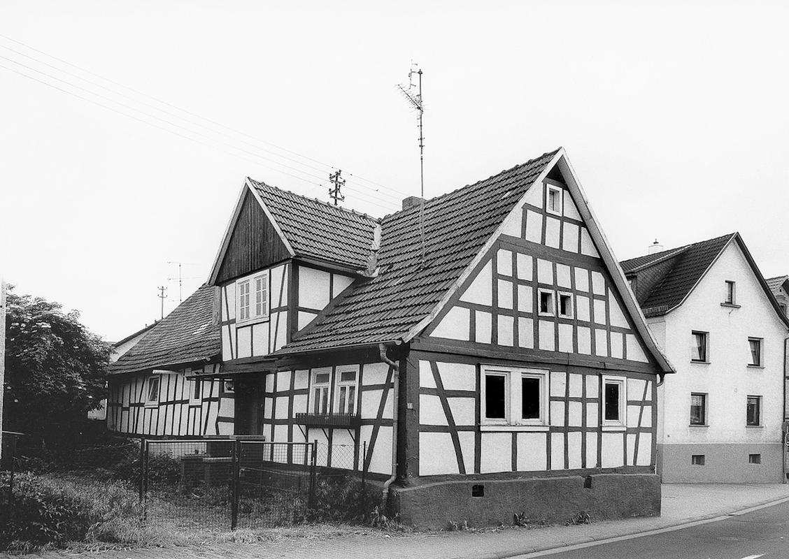Vorderer Teil eines giebelständigen, eingeschossigen Doppelwohnhauses. Dieser Teil aus dem frühen 19. Jahrhundert in schlichtem Fachwerk auf verputztem Kellersockel aus Sandstein, Satteldach mit Aufschiebling. Zwerchhaus Ende des 19. Jahrhunderts aufgesetzt. Erschliessung traufseitig über einläufige Außentreppe.