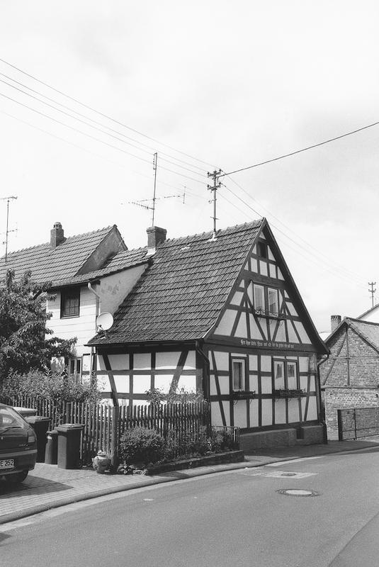 Giebelständiges, eingeschossiges Wohnhaus um 1800. Auf verputztem Kellersockel Erdgeschoss in einfachem Fachwerk mit gebogenen Streben, im Giebel mit Mannfiguren. Zwerchhaus mit Pultdach nachträglich. Erschliessung traufseitig über einläufige Außentreppe.