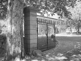 Straßenseitige Einfriedung mit teils mannshoher, teils halbhoher Sandsteinmauer, Zufahrt durch ein hohes schmiedeeisernes Tor in neogotischen Formen zwischen, gebänderten, quadratischen Pfosten mit profilierten Abschlussplatten und davor gesetzten Prellsteinen, im Einfahrtsbereich große Kastanien. Die Anlage ist aus historischen Gründen als Sachgesamtheit geschützt.