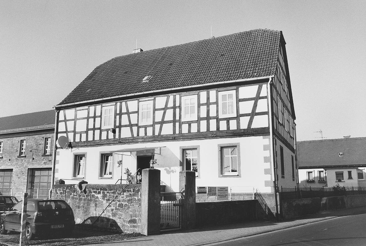 Stattliches, giebelständiges Wohnhaus des herrschaftlichen Hofguts der Grafen von Ysenburg aus dem späten 18. Jahrhundert. Auf Keller aus Sandsteinquadern ein massives, verputztes Erdgeschoss mit Eckquaderung, Tür- und Fenstergewänden in Werkstein, Obergeschoss und Giebel in schlichtem Sichtfachwerk mit hohem Diagonalstreben und Kopfecklättern am Straßengiebel, Krüppelwalmdach mit Aufschiebling.